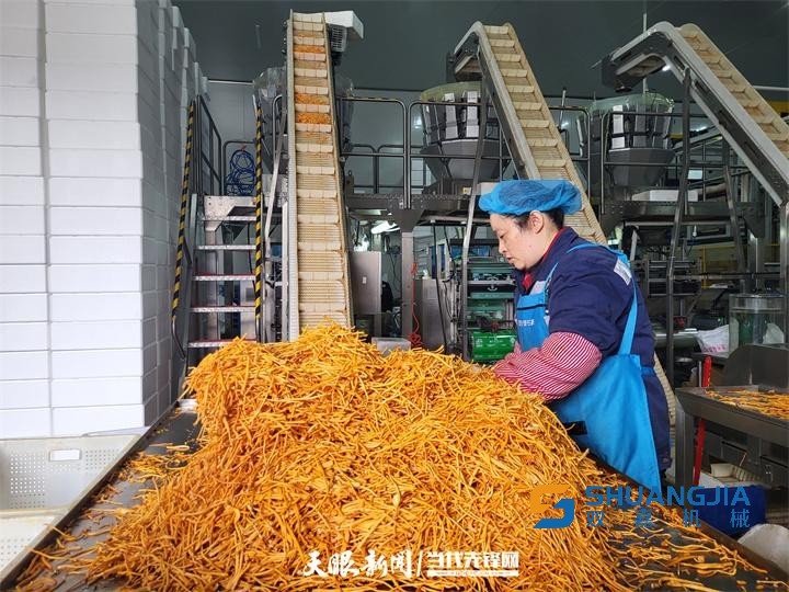 走進(jìn)工廠,只見數(shù)十臺(tái)自動(dòng)化設(shè)備有序運(yùn)轉(zhuǎn),一袋袋包裝精美的蟲草花經(jīng)過裝盆、滅菌、接種、培養(yǎng)、出菇、包裝等工序后發(fā)往川渝、兩廣及海外市場(chǎng)。
