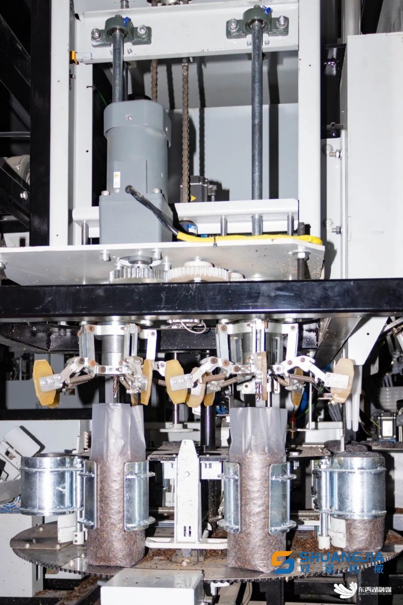 在自動裝袋區(qū),生產(chǎn)線代替人工完成套袋、填料、窩口、插棒、裝袋進筐等一系列復(fù)雜動作。立式螺旋填料方式讓裝料更密實,每包菌棒長度、重量一致。